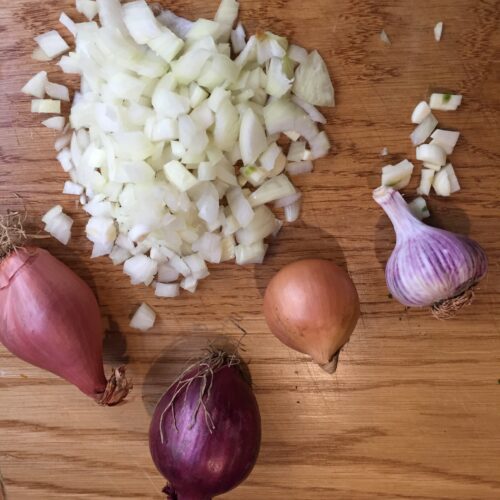 - Wie bei jeder Gemüsesuppe wird das Gemüse grob gehackt und 5 min. im hitzebeständigen Öl angedünstet. Dazu eignen sich das geschmacksneutrale und hitzebeständige Rapsöl. Steckrüben, Zwiebeln, Knoblauch und Sellerie in Rapsöl anschwitzen. Nach 5 Minuten Wasser dazu geben, bis das Gemüse schwimmt. Mit Salz und Kurkuma würzen und 10 Minuten köcheln lassen. Anschließend die Suppe pürieren und mit weißem Pfeffer abschmecken.Für das Topping:Für das "Möhren-Paesto" werden zwei Möhren und die 50g Gruyère in einer Küchenmaschine raspeln und mit 4-5 EL nativen Olivenöl vermengt. Anschließend mit Pfeffer und Salz abschmecken.Die Sonnenblumenkerne werden in einer Pfanne geröstet und extra gereicht.Der Parma Schinken wird im Ofen bei 200 Grad 5 min. gebacken, oder in der Pfanne kurz angebraten.Die Petersilieblättchen zupfen und 10 sec. im heißen Rapsöl frittieren. Danach auf ein Küchenpapier zum Abtropfen legen.Die Suppe auf den Teller geben und mit einen Löffel Möhren-Paesto garnieren. Den Parmaschinken und die Sonnenblumenekerne auf die Suppe legen und mit der frittierten Petersielie bestreuen.Auf dem Foto seht ihr, was ich unter "grob hacken" verstehe und es gibt Schalotten und Zwiebeln. Also die gemeine Küchenzwiebel ist größer und gewinnt an Geschmack, wenn man sie anbrät. Schalotten sind kleiner und werden, wenn man sie zu sehr erhitzt, bitter. Bei Salaten erhält sie den Vorzug!