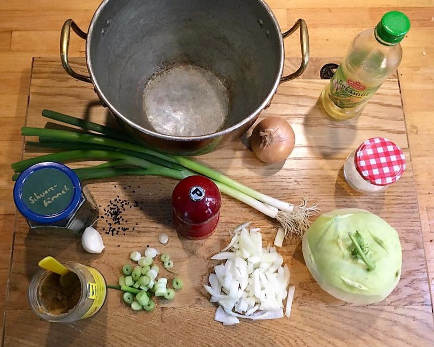 - Wasser dazu geben, bis der Kohlrabi schwimmt. Mit Gemüsebrühe und Schwarzkümmel 10 - 15 min. köcheln.